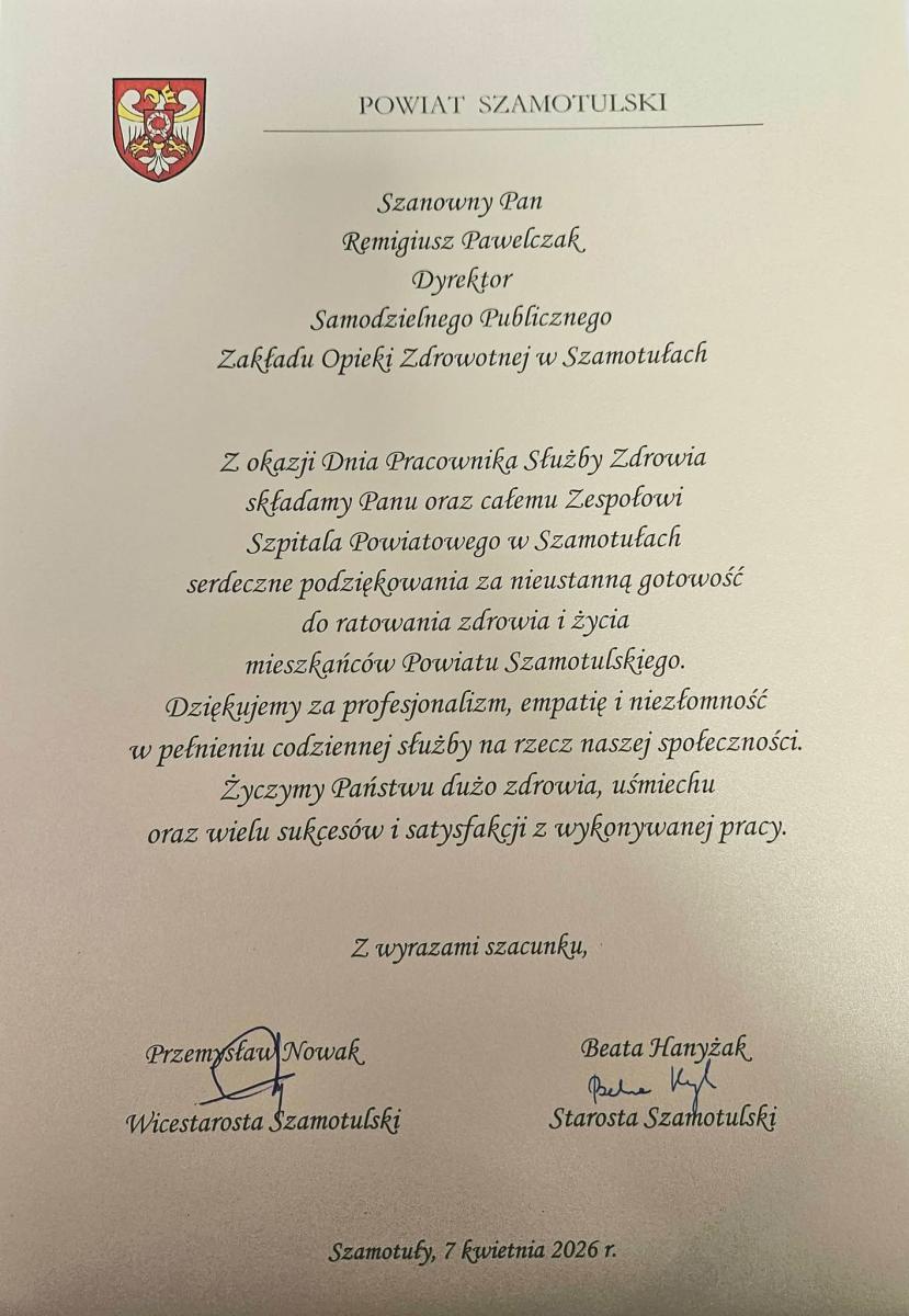 Z tej okazji szpital odwiedzili Starosta Szamotulski Beata Hanyżak oraz Wicestarosta Przemysław Nowak. Nasi goście złożyli serdeczne podziękowania oraz wyrazy uznania przedstawicielom zawodów medycznych: Pani Doktor – Dyrektor ds. Medycznych, Naczelnej Pielęgniarce, Opiekunowi Medycznemu, Sanitariuszowi, Rejestratorce Medycznej, Salowej oraz Technikowi RTG za ich codzienną, pełną poświęcenia pracę na rzecz drugiego człowieka, życząc jednocześnie pomyślności na dalszej drodze zawodowej.